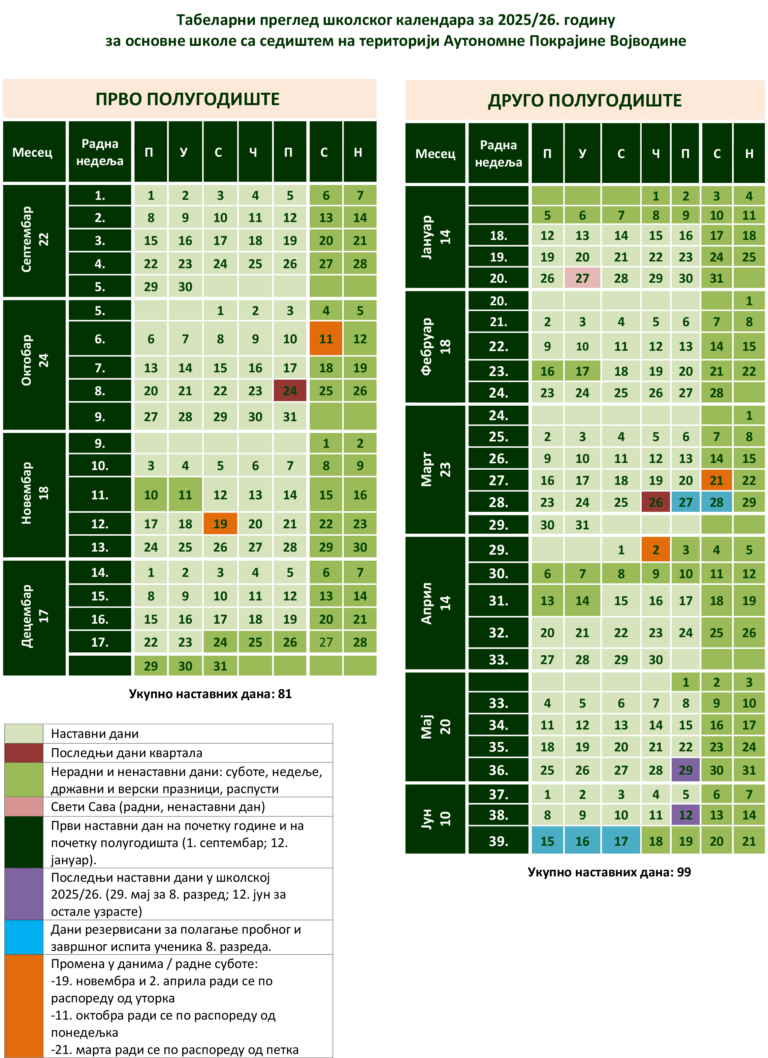Школски календар за основне школе на територији АП Војводине за школску 2025/2026. годину можете преузети овде.